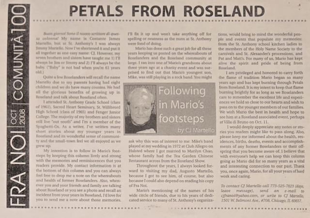 It’s taken a long time to get here, but you are now reading the 205th Petals from Roseland column that I’ve written! I took over writing this column from Mario Avignone when Fra Noi was still a tabloid-sized newspaper. That was when you were able to read all the publication’s content in print. But when the switch was made to a more manageable magazine format, the community columns appeared in whole on Fra Noi’s website, with teaser articles and e-blast links driving traffic to the online version.