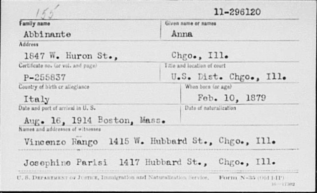 These cards have different information. The name and address are there but now they only give you the age instead of the birth date. The court is almost always “U.S. District Court at Chicago Illinois” and the petition number is shown below. The date of naturalization is often stamped on the card, which you need to use to subtract the age to help you decide if you have the correct Vito Rocco Abbinante.