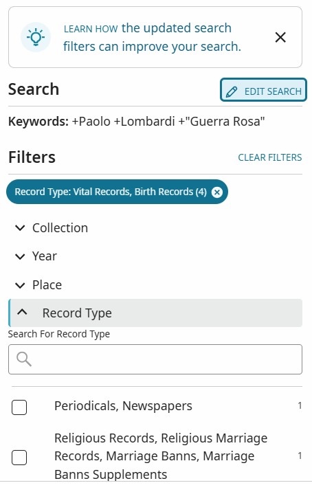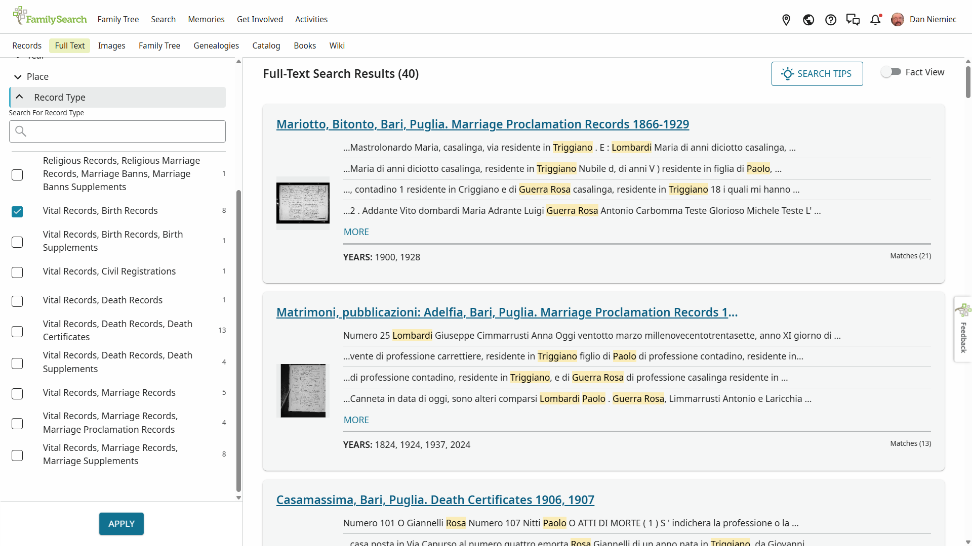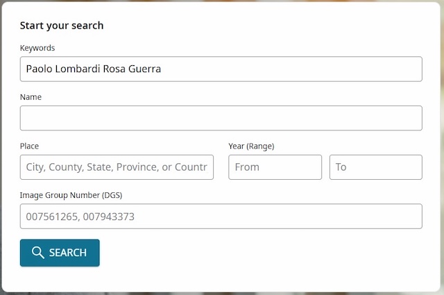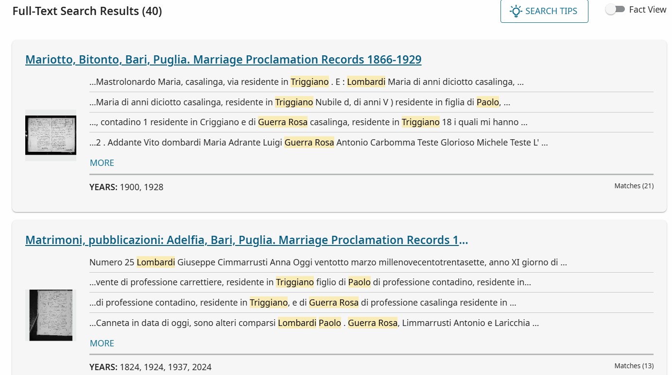 Let’s search for all the children of this couple: Paolo Lombardi and Rosa Guerra. They were married in 1900, so all their children should be born after the full-text starts.