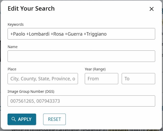 First we have keywords, then name, then place, then range of years, then image group numbers (forget those for now.) I have to say that my first few days of searches of Italian records have proven the following. (This is my personal evaluation and maybe I’m wrong.)