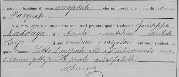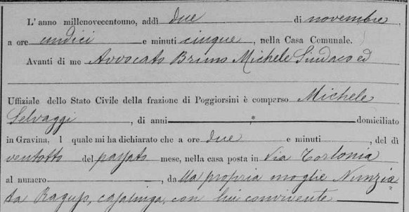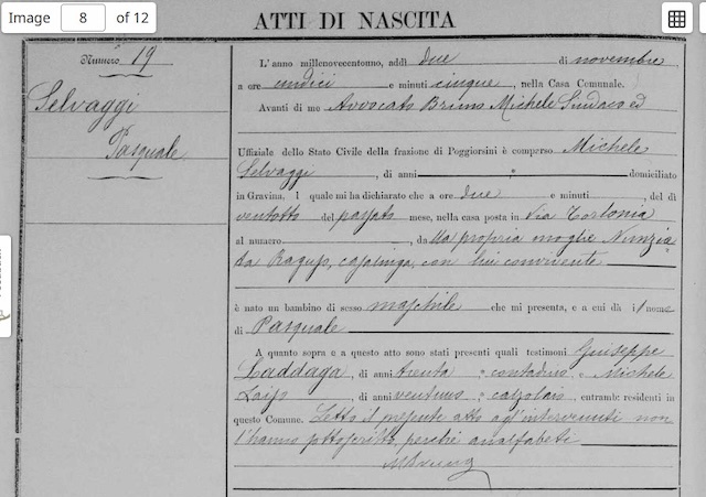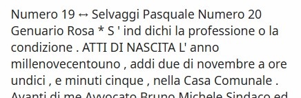 On the left margin of this record is the record number and the name, with surname first and give name second. Numero 19 Selvaggi Pasquale. You can see this in the text on the right.