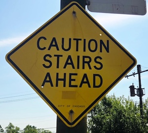 Recently I was driving through the Beverly community when I saw this sign “CAUTION STAIRS AHEAD” on a light post over a sidewalk heading to Longwood Drive. The sidewalk heading downhill turned into steps to ease the downhill walk.