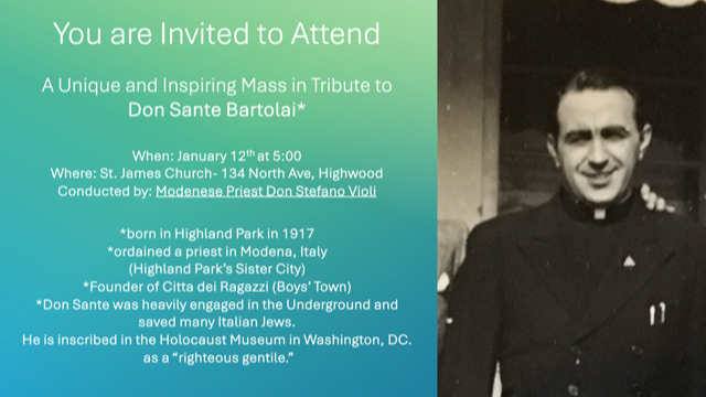 Don Stefano will be conducting a Mass in tribute to Don Sante Bartolai at 5 p.m. on Jan. 12 at St. James Church in Highwood. He and his delegation will be recognized with a proclamation at Highland Park’s City Hall.