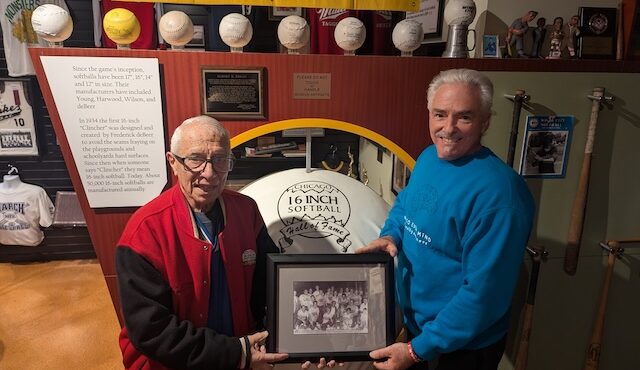 The 16 Inch Softball Hall of Fame on Harrison Street in Forest Park is open from noon to 4 p.m. Saturdays, and most weeks you can find Frank and Tom there with other Hall of Fame inductees and honorees sharing stories with visitors about how the game has evolved over the decades.